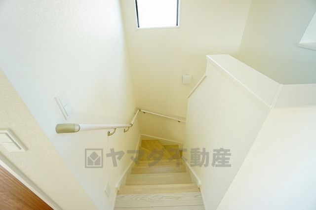 小さなお子様やご高齢の方でも安心できる、手すり付き階段。段差も低めで設定されており、安全性にも優れています。