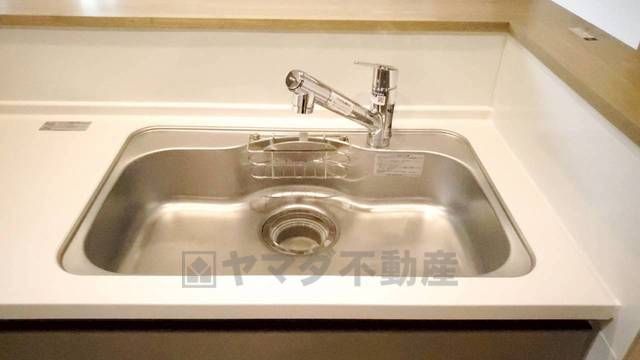 広々としたステンレスシンクには、洗剤やスポンジを収納出来るラック付き。広さも確保しているので、大きなお鍋も洗いやすいです。