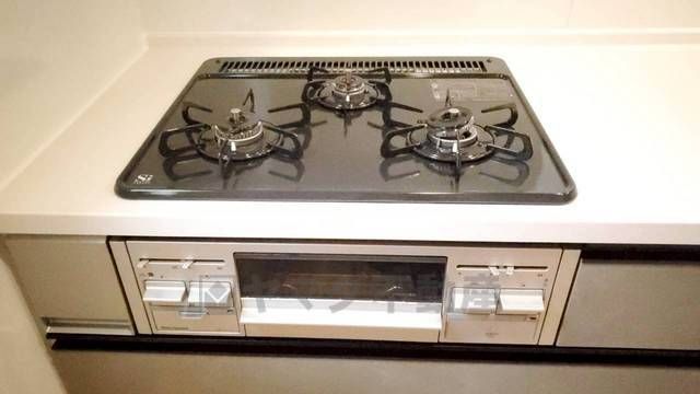 3種類の料理が同時に調理できる、3口ガスコンロ。忙しい夕食の支度時間が短縮できて嬉しいですね。