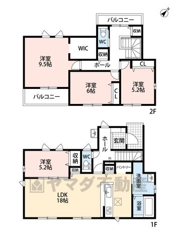 LDK18畳(1F)、洋5.2畳(1F)、洋9.5畳(2F)、洋6畳(2F)、洋5.2畳(2F) |