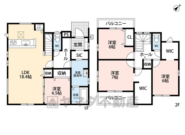 LDK18.4畳(1F)、洋4.5畳(1F)、洋7畳(2F)、洋6畳(2F) |