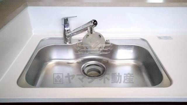 広々としたステンレスシンクには、洗剤やスポンジを収納出来るラック付き。広さも確保しているので、大きなお鍋も洗いやすいです。