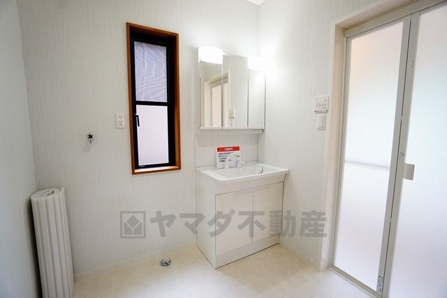 三面鏡つき洗面台。鏡裏にたっぷりとした収納スペースがあります。鏡を閉めてしまえば小物は見えないため、スッキリとした印象の洗面台にできます。