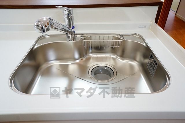 広々としたステンレスシンクには、洗剤やスポンジを収納出来るラック付き。広さも確保しているので、大きなお鍋も洗いやすいです。