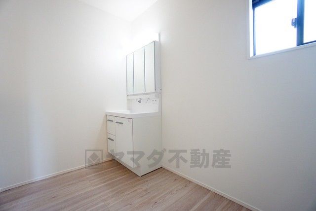 三面鏡つき洗面台。鏡裏にたっぷりとした収納スペースがあります。鏡を閉めてしまえば小物は見えないため、スッキリとした印象の洗面台にできます。