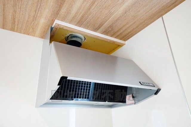 風量が弱・強と切替え可能なレンジフードが調理中の煙をしっかり吸い込みます。手元を照らすライト付きです。