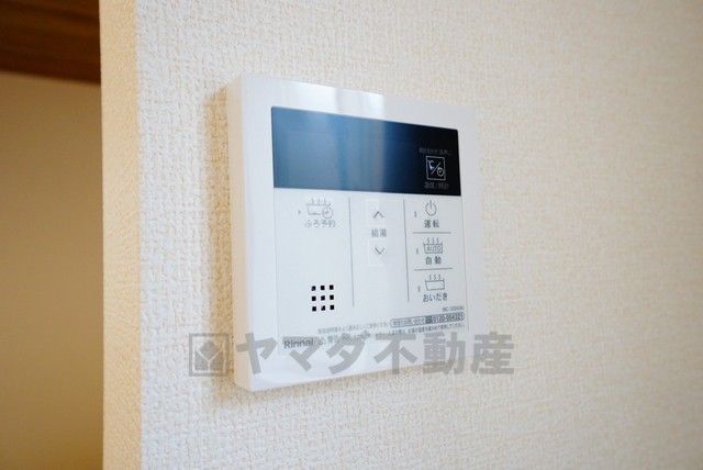 キッチン横からお湯張り、追い炊き、足し湯がボタン一つで楽々操作できる給湯機リモコンです。忙しい夕飯準備の時間帯に重宝しますね。