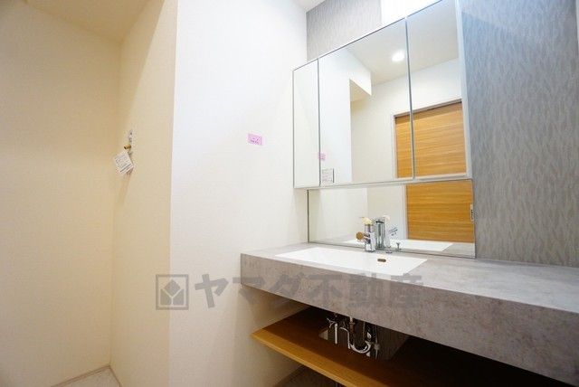 三面鏡つき洗面台。鏡裏にたっぷりとした収納スペースがあります。鏡を閉めてしまえば小物は見えないため、スッキリとした印象の洗面台にできます。
