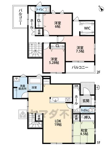 LDK19畳(1F)、和4.5畳(1F)、洋5.2畳(2F)、洋6畳(2F)、洋7.5畳(2F) |