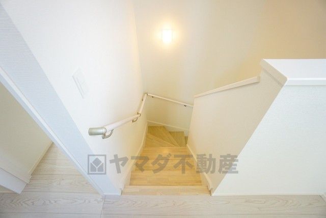 小さなお子様やご高齢の方でも安心できる、手すり付き階段。段差も低めで設定されており、安全性にも優れています。