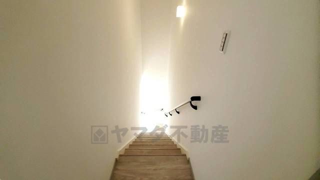 小さなお子様やご高齢の方でも安心できる、手すり付き階段。段差も低めで設定されており、安全性にも優れています。