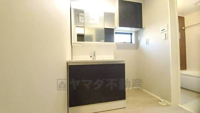三面鏡つき洗面台。鏡裏にたっぷりとした収納スペースがあります。鏡を閉めてしまえば小物は見えないため、スッキリとした印象の洗面台にできます。