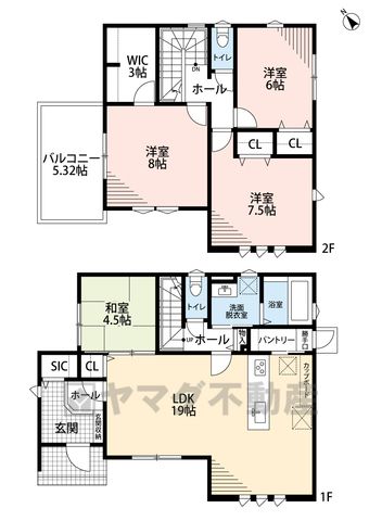 LDK19畳(1F)、和4.5畳(1F)、洋6畳(2F)、洋7.5畳(2F)、洋8畳(2F) |