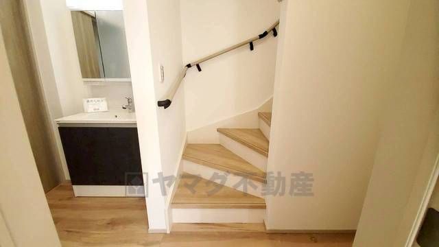 小さなお子様やご高齢の方でも安心できる、手すり付き階段。段差も低めで設定されており、安全性にも優れています。