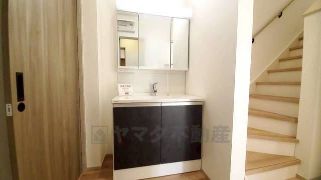 三面鏡つき洗面台。鏡裏にたっぷりとした収納スペースがあります。鏡を閉めてしまえば小物は見えないため、スッキリとした印象の洗面台にできます。