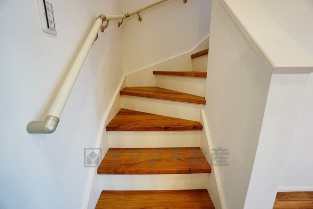 同仕様写真。小さなお子様やご高齢の方でも安心できる、手すり付き階段。段差も低めで設定されており、安全性にも優れています。