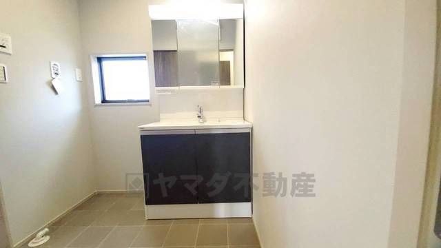 三面鏡つき洗面台。鏡裏にたっぷりとした収納スペースがあります。鏡を閉めてしまえば小物は見えないため、スッキリとした印象の洗面台にできます。