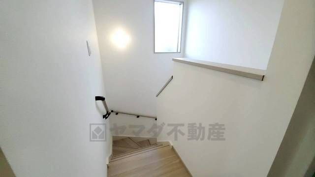 小さなお子様やご高齢の方でも安心できる、手すり付き階段。段差も低めで設定されており、安全性にも優れています。