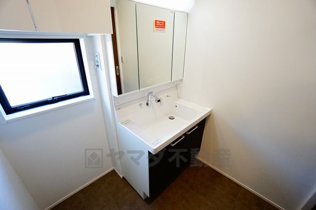 同仕様写真。三面鏡つき洗面台。鏡裏にたっぷりとした収納スペースがあります。鏡を閉めてしまえば小物は見えないため、スッキリとした印象の洗面台にできます。