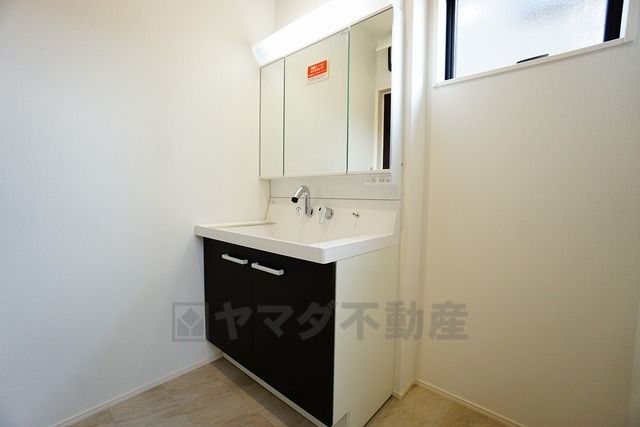 同仕様写真。三面鏡つき洗面台。鏡裏にたっぷりとした収納スペースがあります。鏡を閉めてしまえば小物は見えないため、スッキリとした印象の洗面台にできます。