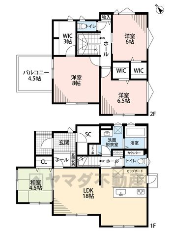 LDK18畳(1F)、和4.5畳(1F)、洋6畳(2F)、洋6.5畳(2F)、洋8畳(2F) |