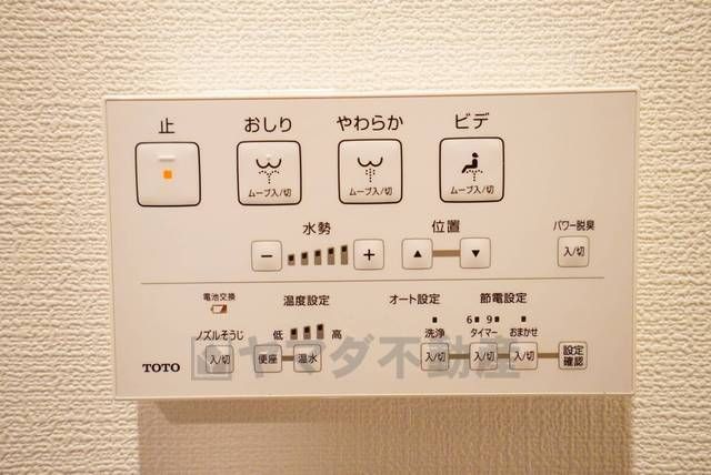 壁リモコンタイプのウォシュレット付き。すっきりした見た目で、トイレ奥の掃除もしやすいです。