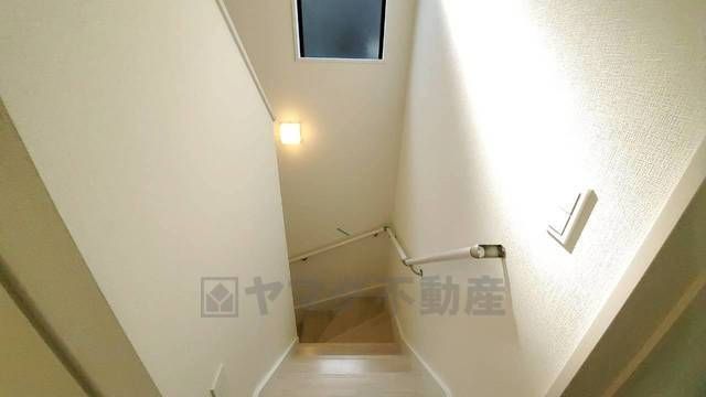 小さなお子様やご高齢の方でも安心できる、手すり付き階段。段差も低めで設定されており、安全性にも優れています。