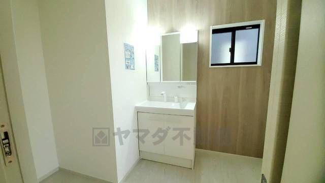 三面鏡つき洗面台。鏡裏にたっぷりとした収納スペースがあります。鏡を閉めてしまえば小物は見えないため、スッキリとした印象の洗面台にできます。