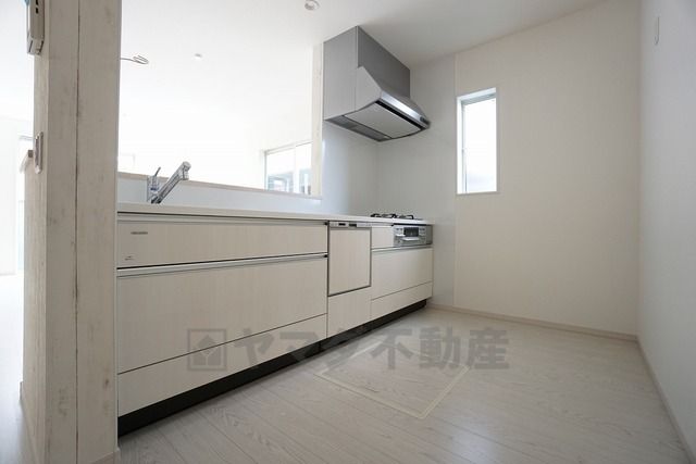 同仕様写真。リビングやダイニングからキッチン周りが丸見えにならない対面式キッチン。テレビ鑑賞や家族との対話がしやすく、ご家族の温かい時間を演出します。