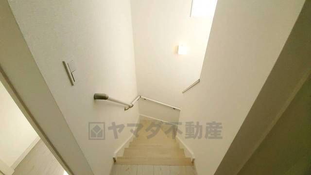 小さなお子様やご高齢の方でも安心できる、手すり付き階段。段差も低めで設定されており、安全性にも優れています。