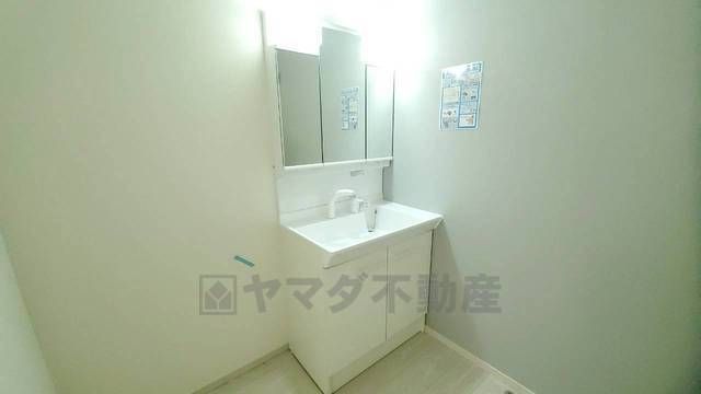 三面鏡つき洗面台。鏡裏にたっぷりとした収納スペースがあります。鏡を閉めてしまえば小物は見えないため、スッキリとした印象の洗面台にできます。
