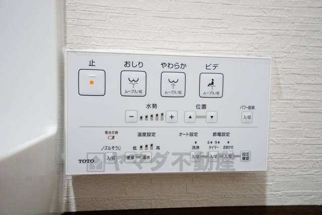 壁リモコンタイプのウォシュレット付き。すっきりした見た目で、トイレ奥の掃除もしやすいです。
