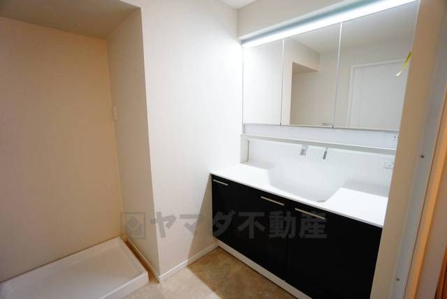 三面鏡つき洗面台。鏡裏にたっぷりとした収納スペースがあります。鏡を閉めてしまえば小物は見えないため、スッキリとした印象の洗面台にできます。