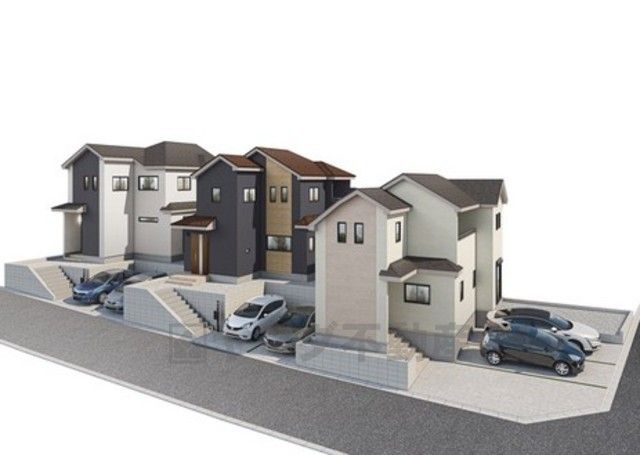 左からA・C・E号棟完成予想図。統一された建物外観はもちろん、前面道路に対して屋根方向を合わせることで統一感を作り出し、街並みとしての資産価値を高めます^^