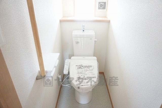 同仕様写真。温水洗浄機付トイレです。節水機能もあるので、安心して使えますね。もちろん、1階2階の2ヶ所にトイレがあるので、忙しい朝にもゆとりができますね。