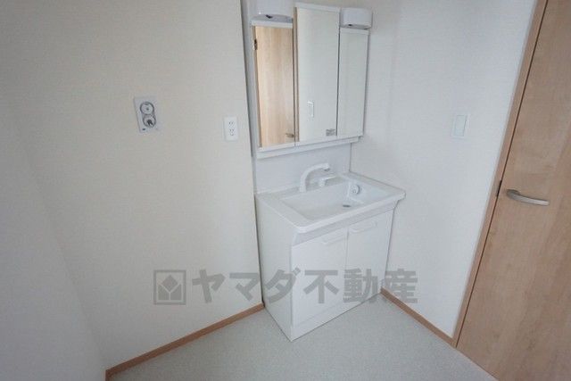 同仕様写真。三面鏡つき洗面台。鏡裏にたっぷりとした収納スペースがあります。鏡を閉めてしまえば小物は見えないため、スッキリとした印象の洗面台にできます。
