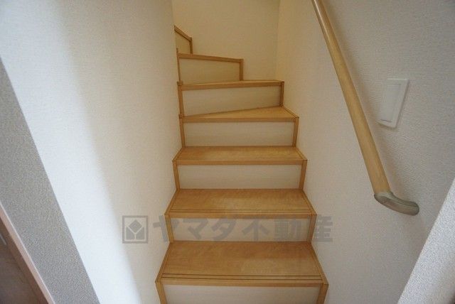 同仕様写真。小さなお子様やご高齢の方でも安心できる、手すり付き階段。段差も低めで設定されており、安全性にも優れています。