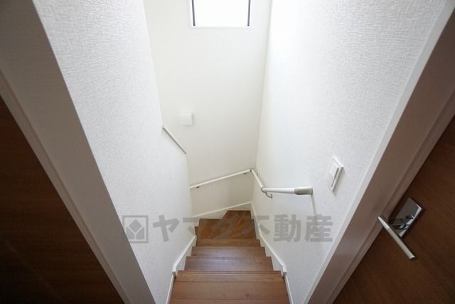 同仕様写真。小さなお子様やご高齢の方でも安心できる、手すり付き階段。段差も低めで設定されており、安全性にも優れています。