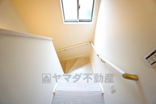 同仕様写真。小さなお子様やご高齢の方でも安心できる、手すり付き階段。段差も低めで設定されており、安全性にも優れています。