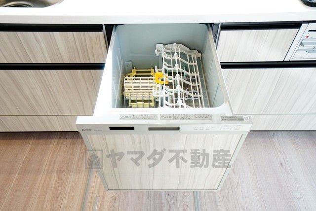 食事の後の手間を解消する食器洗い乾燥機付。冬場の洗い物で手荒れの悩みもなくなります。手洗いよりも節約できて便利。