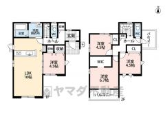 LDK16畳(1F)、洋4.5畳(1F)、洋4.5畳(2F)、洋6.7畳(2F) |