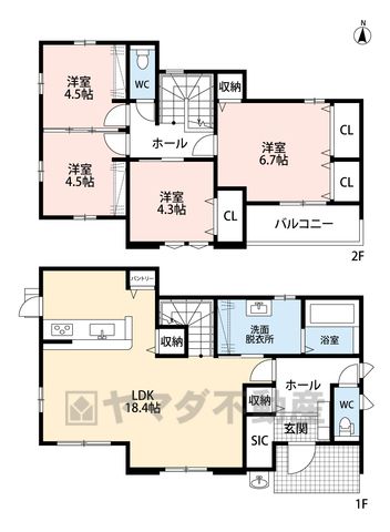 LDK18.4畳(1F)、洋4.3畳(2F)、洋4.5畳(2F)、洋6.7畳(2F) |