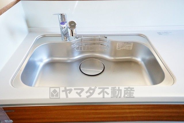 広々としたステンレスシンクには、洗剤やスポンジを収納出来るラック付き。広さも確保しているので、大きなお鍋も洗いやすいです。