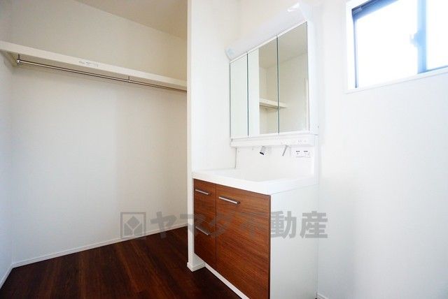 三面鏡つき洗面台。鏡裏にたっぷりとした収納スペースがあります。鏡を閉めてしまえば小物は見えないため、スッキリとした印象の洗面台にできます。