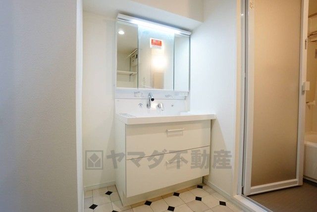 三面鏡つき洗面台。鏡裏にたっぷりとした収納スペースがあります。鏡を閉めてしまえば小物は見えないため、スッキリとした印象の洗面台にできます。
