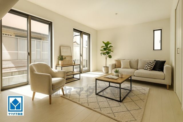 家具はイメージです。大きな窓のあるリビングは、陽光あふれる明るい空間です。居心地良く、ご家族皆がゆったり寛げる憩いの空間となりそうです。