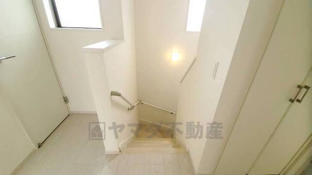 小さなお子様やご高齢の方でも安心できる、手すり付き階段。段差も低めで設定されており、安全性にも優れています。
