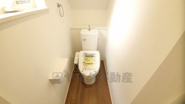 温水洗浄機付トイレです。節水機能もあるので、安心して使えますね。もちろん、1階2階の2ヶ所にトイレがあるので、忙しい朝にもゆとりができますね。