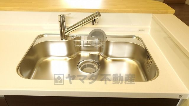 広々としたステンレスシンクには、洗剤やスポンジを収納出来るラック付き。広さも確保しているので、大きなお鍋も洗いやすいです。