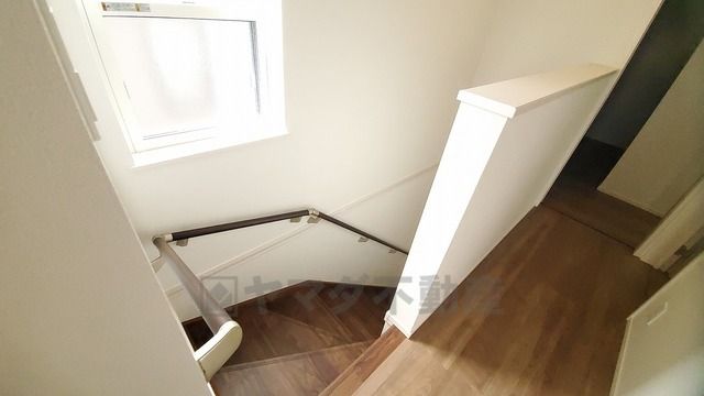 小さなお子様やご高齢の方でも安心できる、手すり付き階段。段差も低めで設定されており、安全性にも優れています。